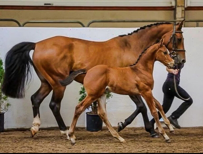 Dam produced licensed stallions Toys (Toulon) who is competing successfully up to 1.60 level, winner Abu Dhabi, Gorla Minore, Spruce Meadows etc Sister Napoli-Tana competed up to 1.30 as 6 year old and was auctioned topper in Verden Grandmother La Belle produced 4 licensed stallions and was Hannovarian mare of the year. Produced 1.60 jumper Cocktailparty. Very impressive performance damline