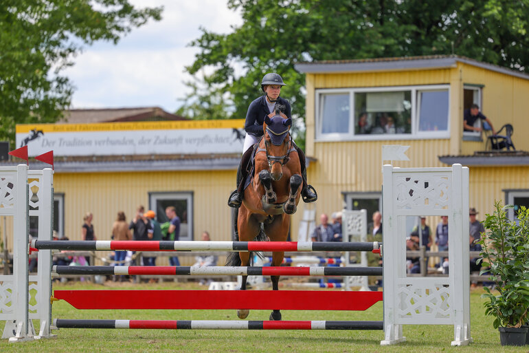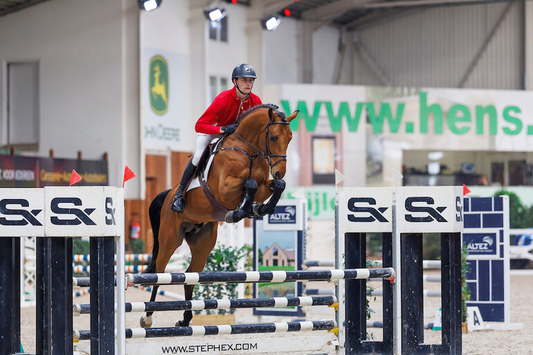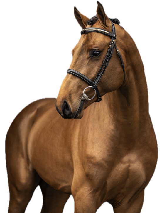 "A sporty stallion with a good frame, a very well-shaped neck and an expressive face. He has a correct foundation with good hooves. He trots closed with a good imprint. The gallop is spacious and has a lot of balance. Under the saddle he made an excellent impression on the test riders. When jumping under the saddle he is very attentive. His leg technique and use of the body are clearly good. He shows a lot of jumping power."