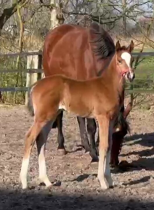 Dieses Stutfohlen von Esmeraldo aus einer OS VerbPr Stute von Zinedream/Cristo/Cassini I besticht durch ein sehr ansprechendes Exterieur, ein absolut korrektes Fundament mit großen Hufen und sehr guten, elastischen Bewegungen. Charakterlich lässt sie ebenfalls keine Wünsche offen. Neugierig, unerschrocken und voller Energie hat sie Motor und Herz am Rechten Fleck. Im Umgang absolut unkompliziert und dem Menschen zugewandt kennt sie selbstverständlich bereits jetzt das tägliche Halftern und Hufe gehen. Sie wächst bei uns im Herdenverband mit weiteren Stuten und Fohlen auf und kann nach dem Absetzen gern zur weiteren Aufzucht bei uns auf dem Hof verbleiben. This filly by Esmeraldo out of an OS VerbPr mare by Zinedream/Cristo/Cassini I impresses with a very appealing conformation, an absolutely correct foundation with large hooves and very good, elastic movements. Her character also leaves nothing to be desired. Curious, fearless and full of energy, she has her motor and heart in the right place. She is absolutely uncomplicated to handle and is very friendly towards people. Of course, she already knows how to be haltered and hoofed every day. She will grow up in our herd with other mares and foals and can stay with us on the farm for further rearing after weaning.